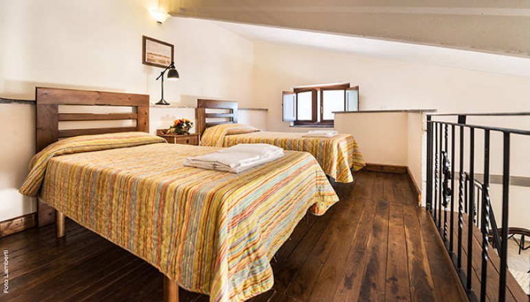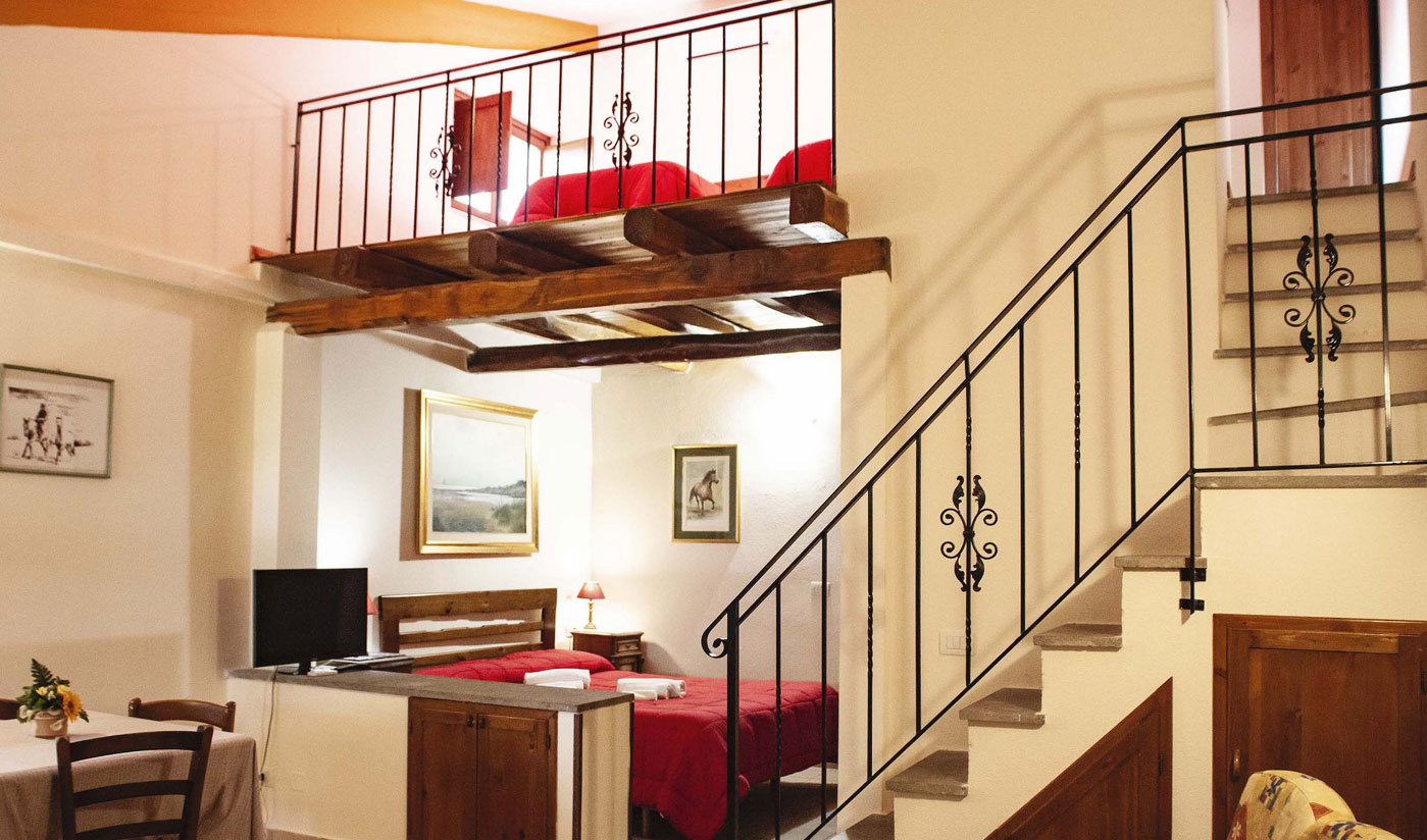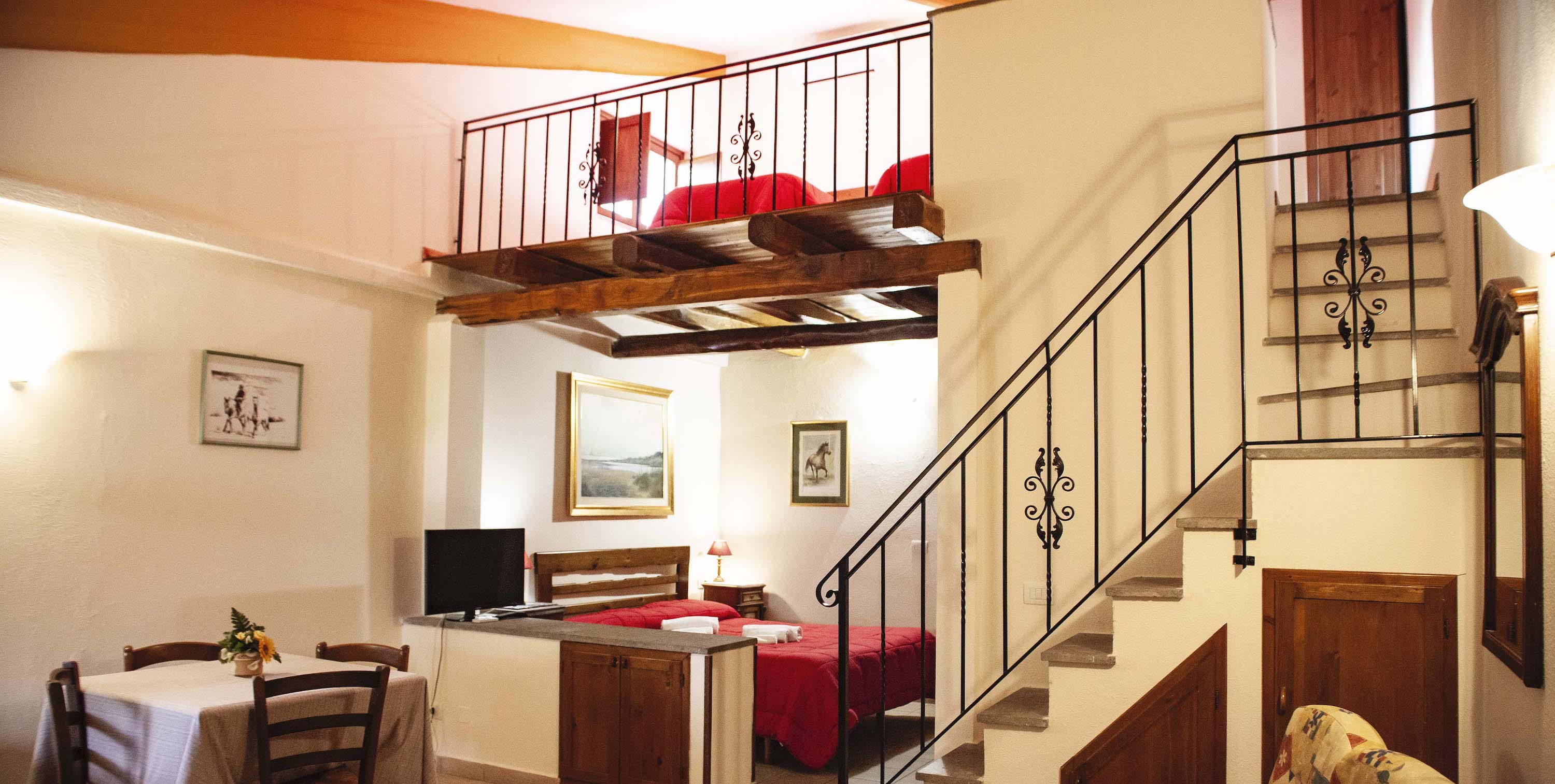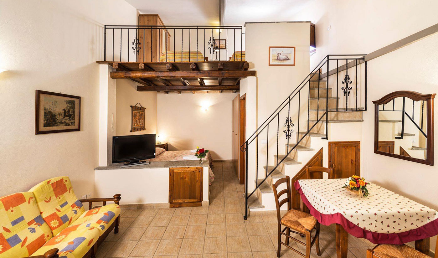 Ogni monolocale è progettato per offrire il massimo del comfort. Disposto su due livelli, l'appartamento è un ambiente intimo e accogliente, con un ampio soggiorno, letto matrimoniale, bagno con doccia e un soppalco in legno che può ospitare fino a tre letti singoli.