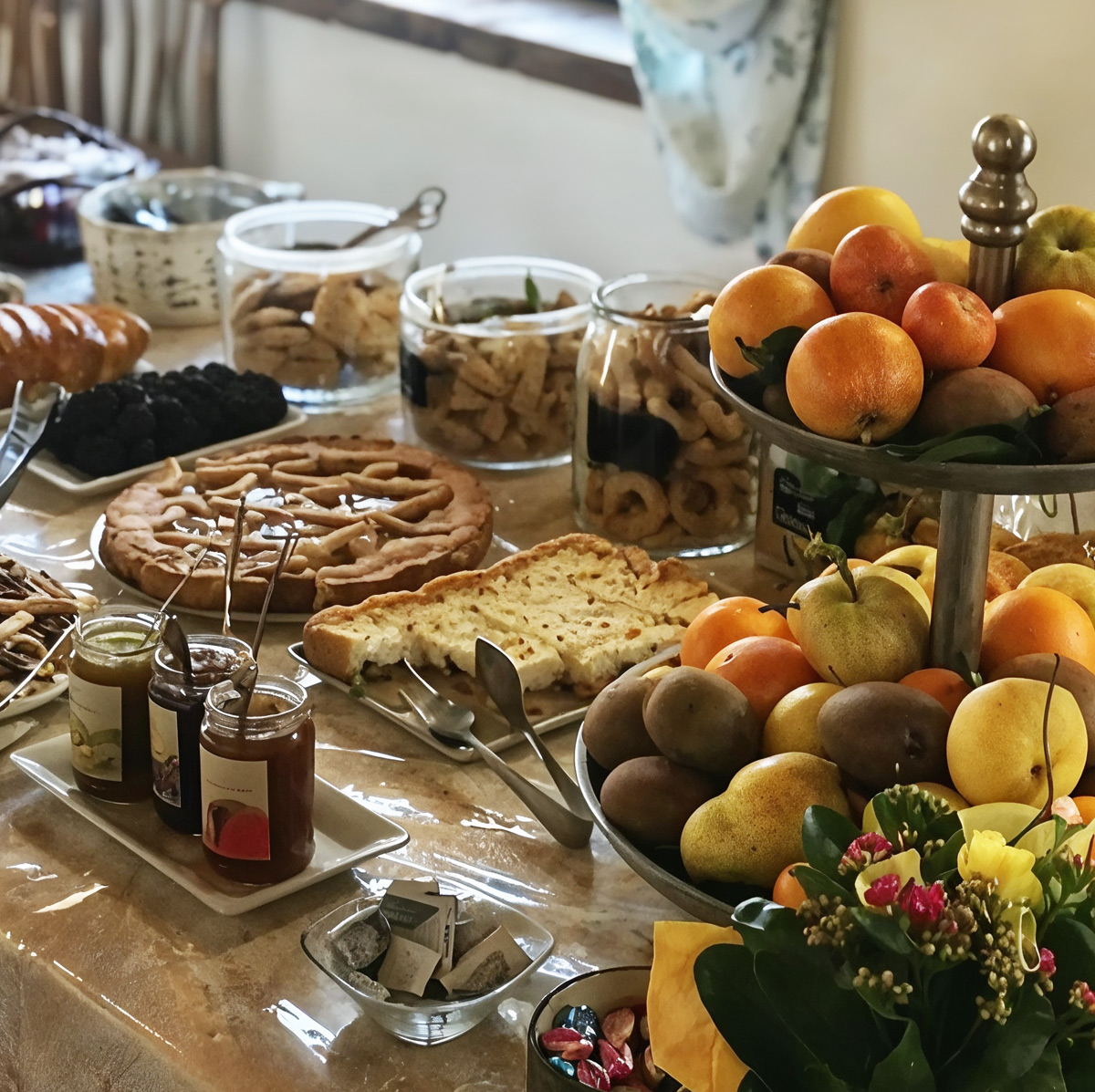 Cerchiamo di soddisfare tutti i gusti con una selezione di prelibatezze preparate quotidianamente, tra cui: caffè, cappuccino, cereali, yogurt, confetture, crostate e ciambelloni fatti in casa, oltre a frutta fresca, macedonia, affettati, formaggi e succhi.